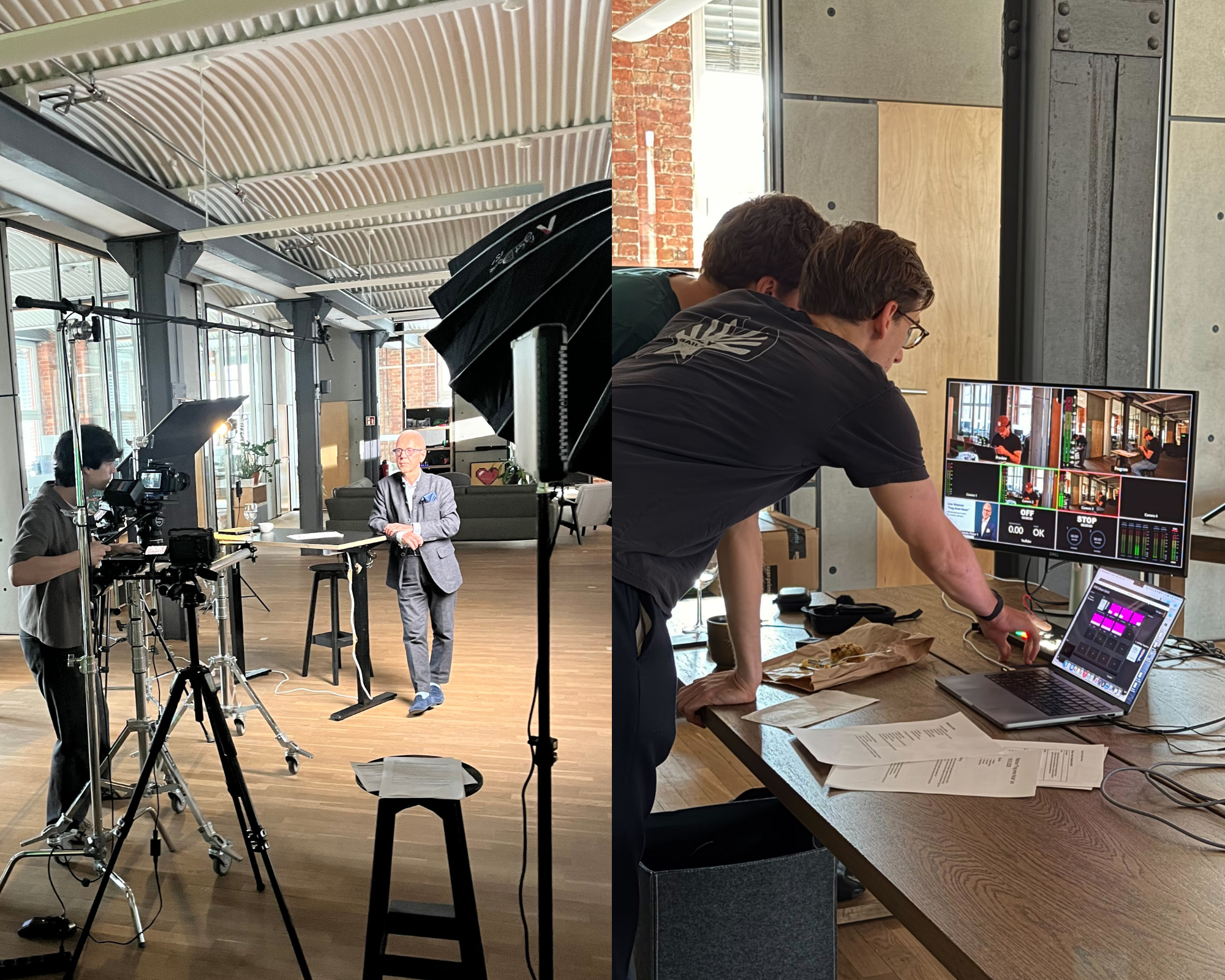 Links: Dr. Lohmeyer beim Dreh der Masterclass; rechts: Vorbereitungen für das Live-Webinar.