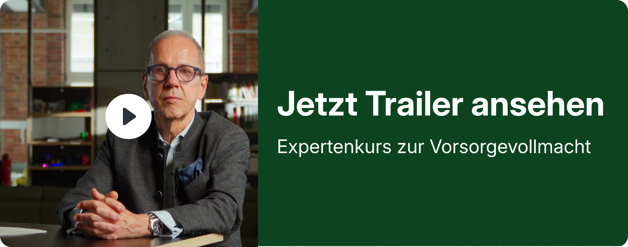 Damit Ihr Wille wirklich zählt, haben wir gemeinsam mit Notar Dr. Lohmeyer einen kostenlosen Expertenkurs entwickelt. Er begleitet Sie Schritt für Schritt zur rechtssicheren Vorsorge (Trailer ansehen).