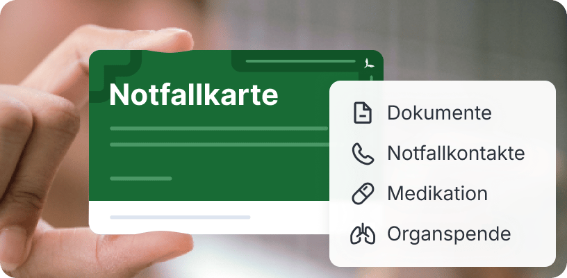 Die Notfallkarte enthält wichtige Gesundheitsinformationen, Notfallkontakte und rechtliche Dokumente wie Patientenverfügung, Vorsorgevollmacht und Organspendeausweis.